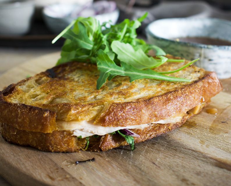 - Cut the sandwich in half and serve with a dressed mixed salad, cherry tomatoes and a chilled glass of wine, or iced soda water and a squeeze of lime.