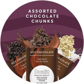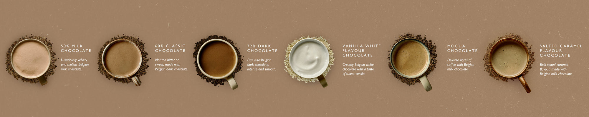 Our range offers something for every chocolate lover! Choose from our delicate 50% Milk Chocolate Chunks, 60% Classic Chocolate Chunks, intense 72% Dark Chocolate Chunks, indulgent Salted Caramel Flavour Milk Chocolate Chunks, creamy Vanilla White Chocolate Chunks or bold Mocha Chocolate Chunks. Can't decide? The Variety Pack lets you enjoy a taste of every flavour.